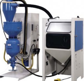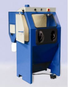 | Las máquinas de chorreado por aire pueden ser salas/cabinas de chorreado en seco o cabinas de chorreado en húmedo. Durante el chorreado en seco (abrasivos de flujo libre secos) y el chorreado en húmedo (mezcla de abrasivos y agua), la granalla se acelera neumáticamente por aire comprimido y se proyecta por las boquillas sobre el componente. La tarea de granallado determina la selección de la granalla seca/húmeda y los abrasivos a utilizar. |
