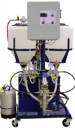 El panel de control incluye un potenciómetro para controlar la velocidad del sistema de dosificación y un LCD indicador de velocidad. Dos depósitos estándar de termoplástico de 57 litros, de alimentación por gravedad con el fondo cónico. Cada línea de alimentación de los depósitos incluye filtros con mallas de 30 mesh. La tapa del depósito de resina incluye un mezclador neumático y la tapa del depósito del isocianato tiene un secador. Usa la pistola de MVP 1:1 Automatic Pro Gun, para la mezcla / dispensación de los materiales A & B, mediante un actuador neumático para abrir / cerrar la pistola. Los materiales A y B sólo entran en contacto en el mezclador estático, por lo que la única parte que se sustituye si la pistola no se limpia es un mezclador estático barato. Depósito de acetona de 10 Lt. con una válvula de purga de aire. |
